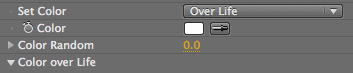 Color controls the particle's color. Active when Set Color is set to At Birth. There is no numeric value for Color. When keyframing this parameter, all particles born at a certain frame gets a certain color.