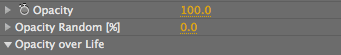 Opacity sets the opacity of the particles. High values give a higher opacity. Low values give more transparency. When keyframing this parameter, all particles born at a certain frame gets a certain Opacity.