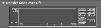 Controls how the particle transfer mode varies over the particle's life. Active when Normal Add or Normal Screen mode is selected. Read more on the Over Life page.