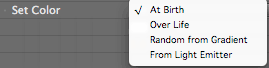 Set Color is the method for setting the particle's color. There are four options. Each option activates other color-related Particle parameters.