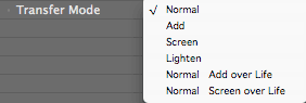 Mode Over Life is useful when transforming one particle volume into another set of particles. For example, let's say that you are creating flames that turn into smoke. While the particle is in the flame, the Transfer Mode should be add or screen, since flames have additive properties. Later on, as the particles becomes smoke, the Transfer Mode should be Normal since smoke has obscuring properties.