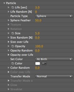 Only active when particle type is Glow Sphere or Star. Glow Size is the relative size for the glow compared to the particle. Opacity, Feather and Transfer Mode controls the look of the glow. Read more on the Glow group page.