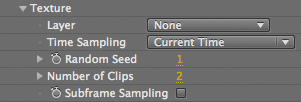 The Texture group lets you select a layer to be the custom particle texture. It also sets the particle texture's behavior, for instance, which frame of the layer to sample from. The particles that use particle textures are the Sprite and Textured Polygon options in the Particle Type popup. All layers or pre-composed layers are valid inputs. You can use a bitmap image, shape layer, movie or pre-comp. If you are using a text layer, that layer must be pre-comped.