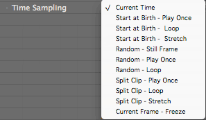 Time Sampling determines which frame of the layer is sampled to generate the custom particle. There are 11 modes. The mode determines which frame the custom particle is sampled from with options for starting from the first frame, picking a random frame, or splitting the layer source into multiple clips.